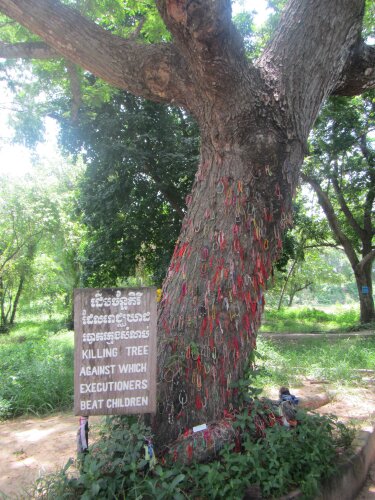 Killing fields of Choeung Ek-Most of the 17k S-21 detainees were executed in the killing Fields. Detainees included children. In fact, there is a tree that was used to kill small children by slamming them into the tree. Visitors leave their bracelets on the tree to show their sympathies to the victims.