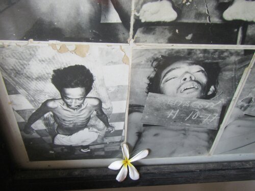 The Tuol Sleng Genocide Museum – The S21 Prison, formerly a high school, was transformed by Pol Pots security forces to include holding cells (0.8 x 2 meters) and torture chambers. About 100 people were killed a day to be punished for false accusations. The Khmer Leaders kept detail records of all the inmates including photographs of the dead tortured bodies, which were displayed. There were only 7 survivors left alive when Vietnam army liberated Phnom Penh in 1979. The surviving 7 were painters, drawers or photographers which were needed skills.