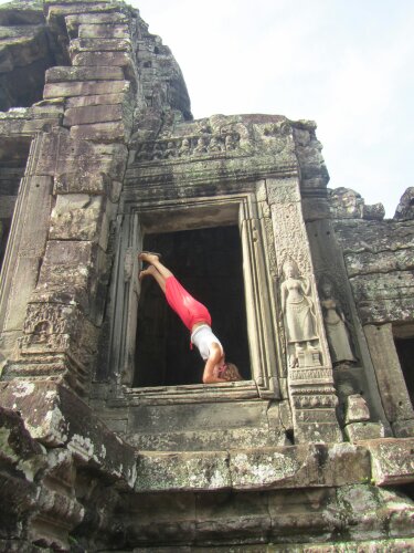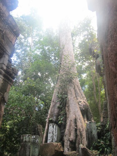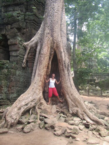 Ta Prohm was my favorite because century old tree’s roots are wrapped around the temple.Β There are two types of trees; silk-cotton (which have huge trunks) and ficus (which strangle a tree with its multiple roots) Tomb Raider and Two Brothers were filmed there.