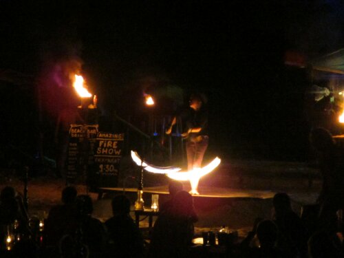 3 Australian guys approached our table to ask if they could join us. Funny thing is we were making fun of one while he was walking up to us because of his big muscles and low cropped sides on his tank. He actually turned out to be the nicest guy and one of the other guys was a complete a hole. We ditched the Aussie crew and went next door to the Irish bar and went right onto the beach to dance with our feet in the water.